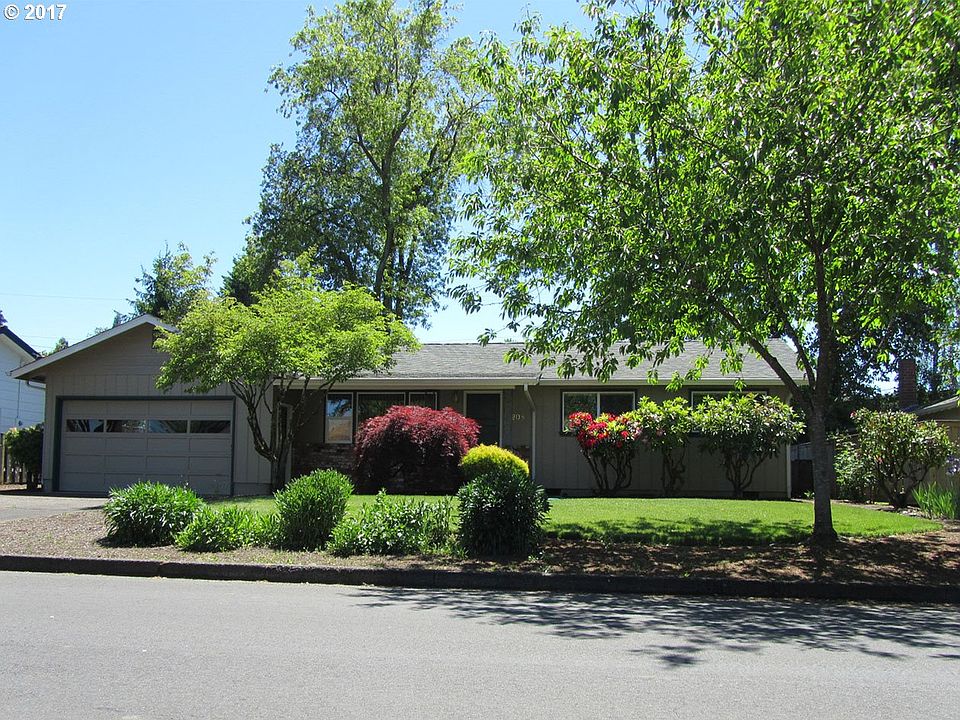 Lovely ranch-style home centrally located! Naturally bright inside with updated vinyl windows & open layout. Large living room with wood-burning fireplace. Dining area w/ sliding door & built-ins. Kitchen with pocket door to laundry room & half bath. The backyard feels like a secluded flower garden or park. Fenced yard with large patio & shed. Workbench in 2-car garage. Less than 1 mile from shops, schools & Willamette River bike path.