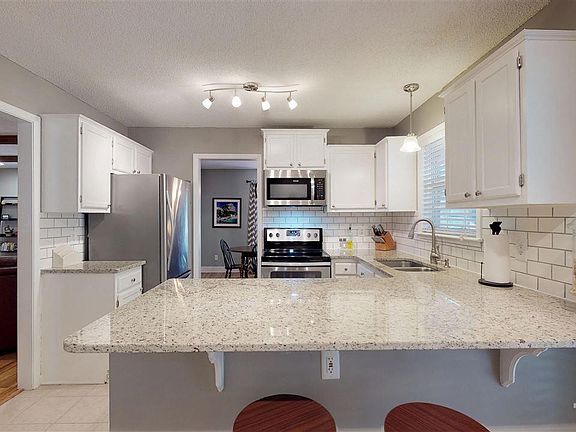Electrifying 1 level living, location, & charm on Electra. Large family room with brick fireplace centers this home. The kitchen shines with white cabinets, stainless appliances, tile backsplash, and granite counters w/eat in bar top plus breakfast area. Separate dining room for formal occasions. Tile Floors in kitchen and both baths. Baths have updated vanities and fixtures. Big fenced back yard with 2 decks. 1 car garage. Refrigerator conveys. Newer roof & HVAC. No HOA dues! Check out the 3D TOUR!