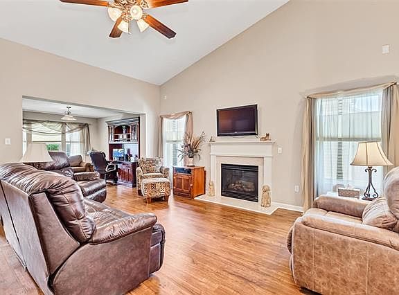 OPEN & AIRY FLOOR PLAN W/VAULTED GREAT RM, KITCHEN & BREAKFAST RMS! CUTE FRONT PORCH WELCOMES YOU INTO THIS WELL MAINTAIND 4 BED, 3 FULL BATH VINYL SIDED RANCH HOME. Wood look vinyl plank flooring less than 1 yr old in DR, GR, entry & hall! Brand new carpeting just installed in master bed, steps & finished lower level! Dining/office offers bay window for lots of natural lighting! Spacious Great Rm w/gas Fireplace. Kitchen features plenty of 42 staggered cabinetry w/crown molding. Center island w/breakfast bar overhang adds storage & work space! Black smooth top stove, blt-in micro & DW. Sliding door off brkfst rm leads to 11x10 deck overlooking treed common ground. Mst suite has wlk-in closet + full bath. Main Floor Laundry! Finished lower level to include huge family rm, 4th bedrm, 3rd full bath + bonus rm/man cave w/slider walks out to patio & fenced-in yard! Perfect for entertaining family & friends! Please exclude window treatment curtains & hardward - all shades to stay.