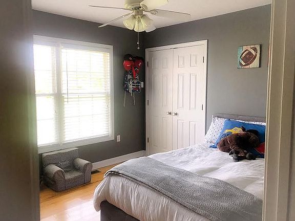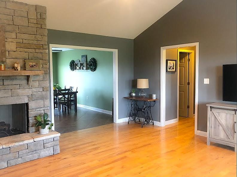 Ranch style home setting on a 1.69 Acre lot. 3 bed 2 bath. 1800+ sq feet. Last updated in 2013. Large Master Suite with attached master closet, and bathroom with soaking tub and separate shower. Vaulted ceilings in the master bedroom and living room. Wood floors throughout the entire home and tile floors located in the kitchen and bathrooms. Large room located above the attached garage. Blacktopped driveway (newly sealed) along with concrete pad that extends from attached garage to back outdoor 2 car garage. Large Kitchen with huge island. French doors leading out to the back stamped concrete patio. Back sidewalk and front sidewalks. Minutes from Rough River Lake. Beautiful unobstructed front views. Gas fireplace located in the living room.