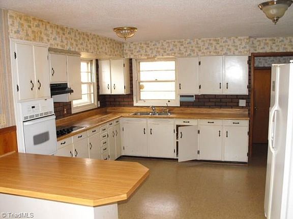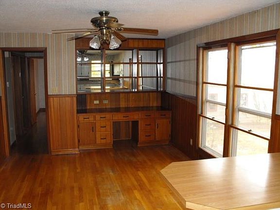 Large home near Elkin Middle / High Schools. One level living with oak floors, 2 fireplaces, built in furniture / shelves, 3 BRs, 2 Baths, wood wainscot, architectural shingles, basement with garage, plus detached 24 x 36 garage (needs work), and a nice yard with a variety of large trees.