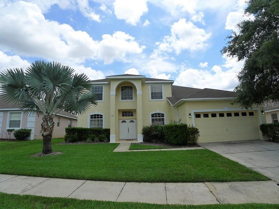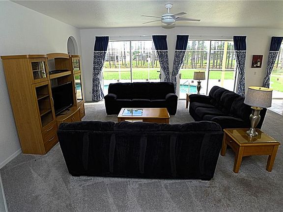 Fantastic fully furnished 6 bed 3 bath home with heated pool over looking tree line. Well looked after and in great condition. New Roof replaced Dec 2020, Pool heater replaced Dec 2018 and new carpets, window treatments and blinds throughout. This beautiful home features over 3000 sq ft of living space, dinette eating area in kitchen and separate formal dining room. Living room allows access to the pool via 3 sliding glass patio doors. Two first floor bedrooms and a full bathroom which allows direct access to the pool area. Upstairs features the master suite with dual sinks, garden tub and walk in shower plus 3 additional bedrooms and a family bathroom. All bedrooms upstairs have walk in closets. The garage has been converted into a games room. Located in the exclusive, highly sought-after Highlands Reserve golf community, close to restaurants, shops, and area theme parks. Low HOA fee. In addition to the golf course, community features include Tennis Courts, playground, and community pool. This home is perfect for a primary residence due to its central location or as an investment home.