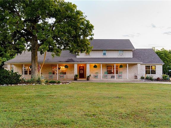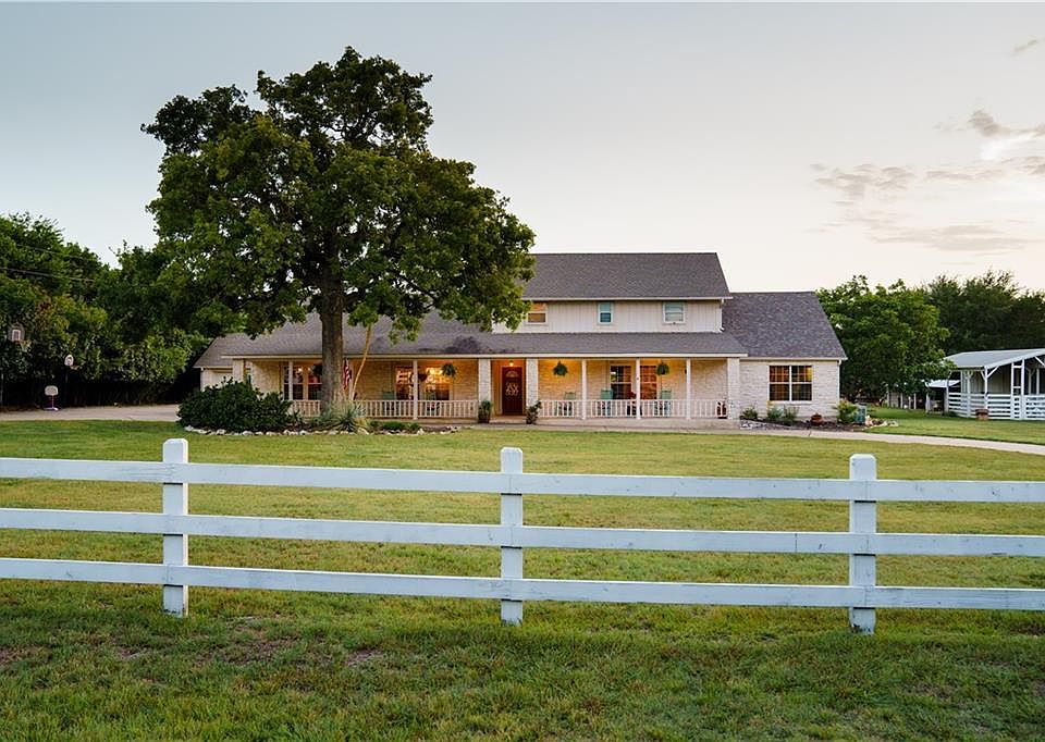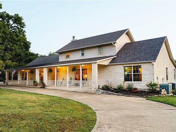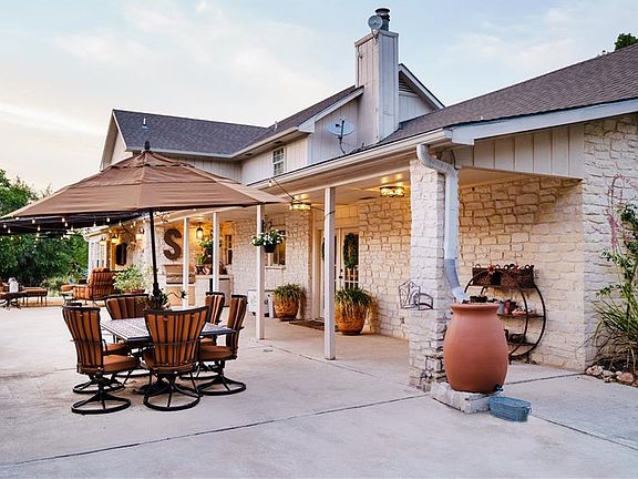Charming unique farmhouse on 2.5 acres! Separate guest house w/kitchen, shower & 2 BRs. Enjoy tranquil sunsets & sunrises from extended rear stone patio & front porch. Privacy by way of fence & mature oaks. Modern country living - recessed lights, crown molding, concrete floors, granite counters, built-in shelves/cabinets, outdoor patio, built-in fire pit & grill. Large temperature controlled storage. Fully fenced & animal-friendly - horses, chickens, goats, dogs welcome!
