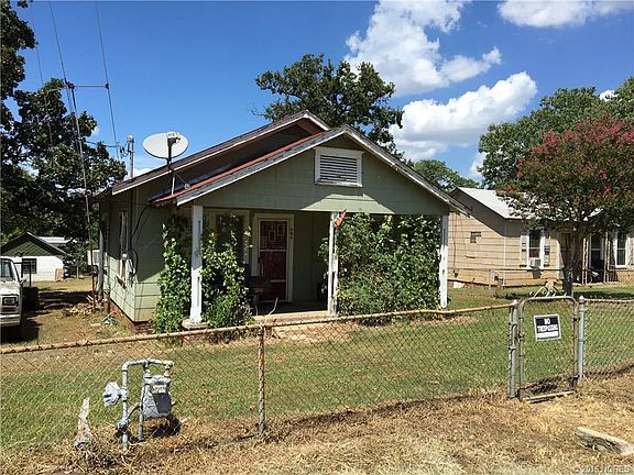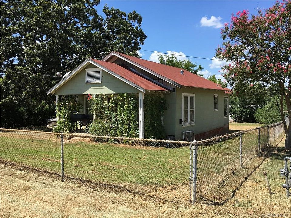 2 bedroom 1 bath home with green siding and a nice concrete block outbuilding.