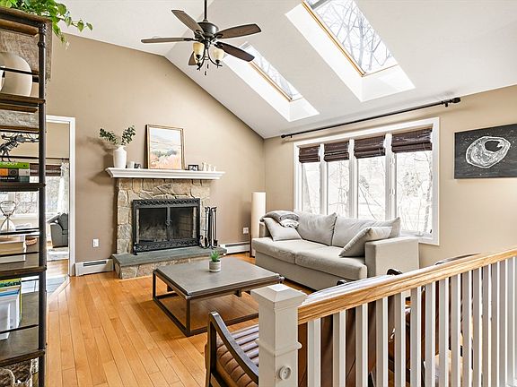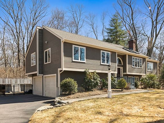 Your search is over! Welcome to this stunning contemporary split-level home with open floor plan and abundant natural light. The updated kitchen boasts white cabinetry, granite counters, a spacious island, and stainless appliances, opening to a vaulted dining and family room. The skylit living room features soaring ceilings and a gorgeous fieldstone fireplace. A fantastic three-season porch leads to a spacious deck with a large grilling area, perfect for entertaining. Beautifully updated full bath includes elegant tile work, a frameless soaker tub, and modern vanity. The master suite offers a private updated bath with sleek finishes. Finished lower level with a half bath is ideal for a large home office or a game, exercise, or media room. A two-car garage, town water/sewer, and a level yard with mature plantings abutting conservation land complete this exceptional home, beautifully set back from the road providing private enjoyment of the deck, pool and green space.