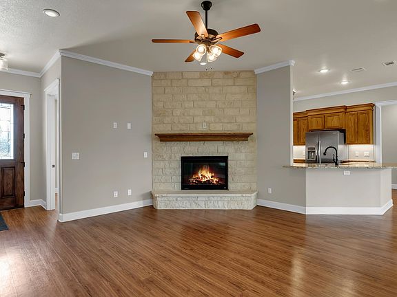 Located in the sought-after Delaware Springs Golf Community, this charming stone home offers the perfect blend of comfort, style, and Hill Country charm. Enjoy peaceful views of the open field behind the home from a brand new spacious deck, perfect for relaxing or entertaining. The backyard features raised garden beds, perimeter fencing, and a generous front yard adds curb appeal. The garage is 700 sq ft, the shed is 10’x16’ and it the yard has a full irrigation system with a faucet near the garden area! Inside, you’ll find light vinyl flooring throughout the main living areas, cozy carpeted bedrooms, an office with vinyl flooring and a welcoming fireplace in the living room. The attic features a radiant barrier to help keep the house cool during the Texas hot months! The mudroom off the laundry room provides functional space, while the primary suite offers a walk-in shower, soaking tub, and a large walk-in closet. Don’t miss your chance to enjoy golf course living with scenic views and the best backyard!