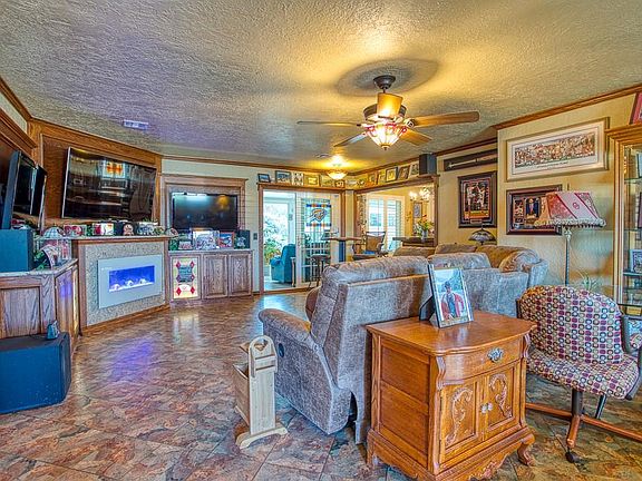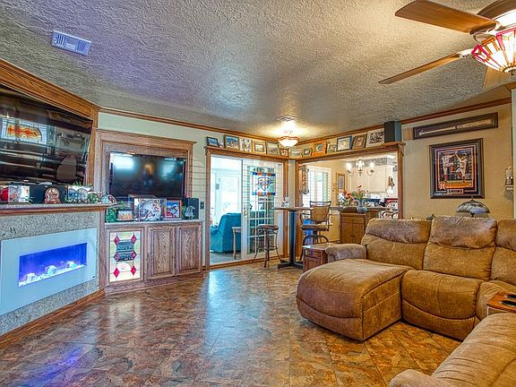 Welcome to this stunning 3 bedroom, 2 bathroom home complete with beautiful custom window shutters and stained glass windows and an open floor concept. The inside has been remodeled to include crown molding finishes above an electric fireplace to provide an elegant touch. The kitchen overlooks the living room and has easy access to the laundry room and garage. The living room is set up for sports center entertainment or Netflix binge nights. The back porch has been enclosed, providing roughly 300 extra sq feet and access to a storm shelter without getting in the storm. Enjoy the picturesque landscaping and relaxing water fountain in the backyard, while outdoor lighting and a fire pit set the perfect ambiance for evening gatherings. In the spring and summer, the backyard