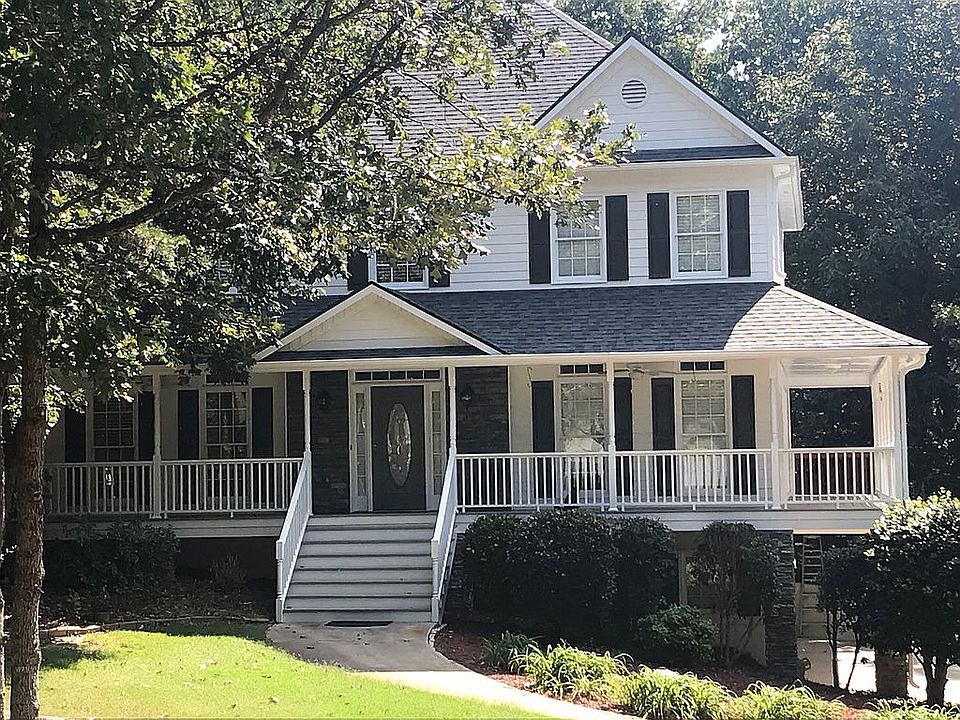 Beautiful Cape Cod home! Grab your lemonade and sit on your wrap around porch while watching the kids play in cul-de-sac. Huge deck perfect for BBQ and yard big enough for a pool! Hardwood floors throughout the main floor including the sunroom that overlooks private yard. Large dining room great for entertaining. This is an entertainer's delight! Huge playroom in basement plus a 3 car garage with side entry. Just under 2 acres! Part of The Falls at Cherokee HOA and minutes from the lake. 3rd car garage deep enough for boat plus trailer!