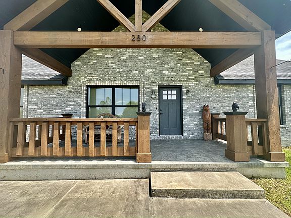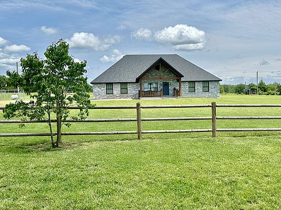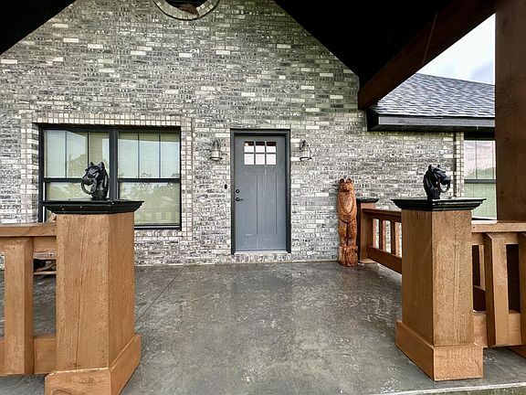 Truly One of a Kind! Too many things to mention, but here are a few. Custom wagon wheel chandelier, antique bathroom vanities, barn wood wall accents, concrete countertops with stamped horseshoe accents. No detail is missed with horse head figures framing the cedar beamed front porch, tree bark accented lighting, saloon doors dividing the mud room and kitchen. Cathedral ceiling in living room, chair rail, crown molding and tin wainscoting in the main living areas, custom ceilings in the bedrooms with wood accents. Wood and tile flooring thru-out, 6 panel pine doors, kitchen features naughty hickory cabinets, farm sink, island, and all stainless steel appliances. HVAC is a heat pump with propane and electric back-up. Covered back deck is 12x14, front porch is 8x20 and oversized garage is 20x22 with storage cabinets and counters.