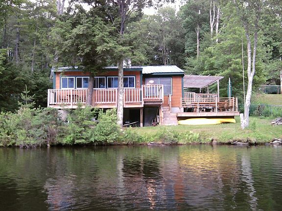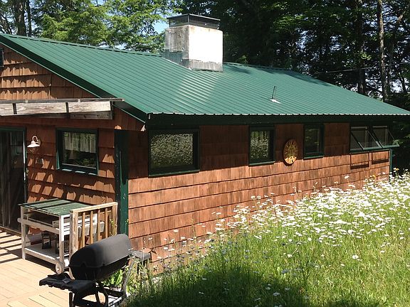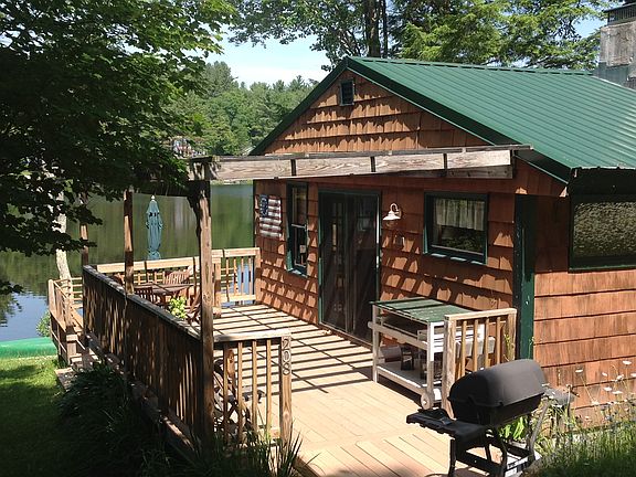 Goshen, waterfront, on pristine Hammond Pond, on the east side, enjoy swimming and boating only steps from your yard and decks. Three-season, beautifully restored home with open floor plan, updated kitchen with built in banquette and updated bath. One bedroom, and porch may be used as such as well. Large slate fireplace along with electric baseboard heat to take away the chill when needed. Basement level for additional storage. Three levels of decking and a dock affording spectacular lake views and sunsets. The association is of great value with large clubhouse at the "Barn" (you may arrange also for private events), library, "chip and putt", 9 holes of golf, tennis court, ball field, and beach all within walking distance. The large pond itself is deep and rated very clean and pure. $274,900. Much furniture is negotiable as well.