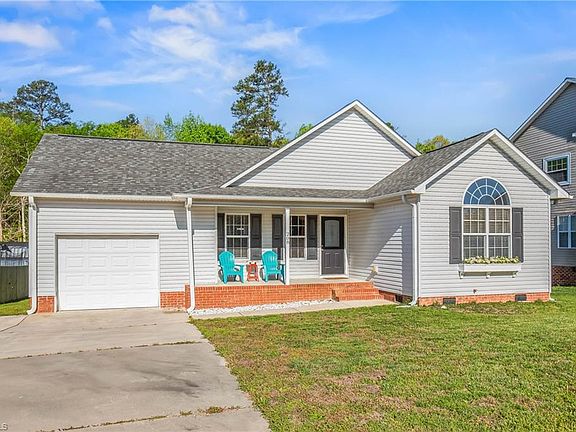 Welcome to easy, one-level living in the popular Millstone Manor neighborhood! This beautifully maintained 3BR/2BA ranch is filled with natural light and features an open layout that’s perfect for entertaining. The vaulted living room flows effortlessly into the dining area and kitchen, complete with stylish tile backsplash and durable LVP flooring. The spacious primary suite offers a vaulted ceiling, walk-in closet, and private bath—your own peaceful retreat. The front guest room also boasts vaulted ceilings and wonderful natural light. Step outside to a serene, tree-lined backyard with a deck ideal for morning coffee or weekend gatherings. A one-car garage with built-in shelving and a charming front porch complete the picture. Convenient to highways and Novant Medical Center, this home offers comfort, function, and a welcoming atmosphere! Possible 100% loan product available for this property - see agent only remarks.