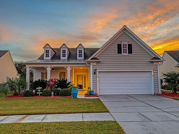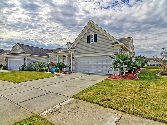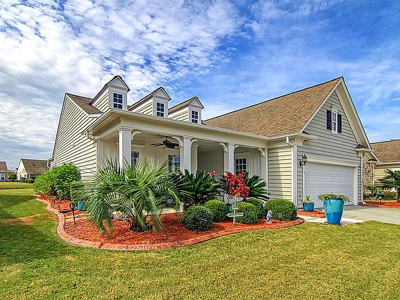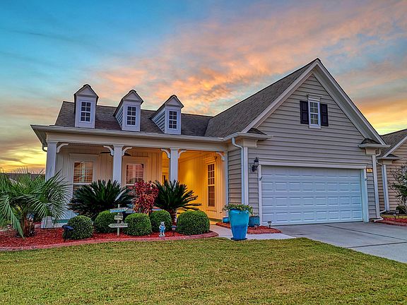 One of the communities most popular floor plans the Copper Ridge model in Charleston's Premier Active Adult community, Del Webb Cane Bay! This 2 bedroom, 2 bathroom, plus den home sits on a gorgeous lagoon homesite with close proximity to the communities amenity center. As you approach the home you are greeted with a front porch with plenty of room for outdoor furniture and extensive landscaping to set the scene. Once inside, a defined foyer complete with wainscoting, two piece crown molding, and charming archway into the main living area. A kitchen complete with 36'' Maple cabinetry, tiled backsplash and stainless steel appliances! Open concept living at its best is highlighted with the kitchen overlooking the dining room, great room, and sunroom; a home perfect for entertaining friends..and family! From the dining area step into a sunroom filled with natural light and breathtaking views! It doesn't stop there, the beautiful views are highlighted with an ample sized patio with brick pavers, retractable awning, and palm trees! Back inside, the primary bedroom is tucked in the back corner of the home and features a tray ceiling, large walk-in closet, tiled flooring in the bathroom, dual sinks, recently renovated shower and garden tub. The second bedroom and bathroom are located on the opposite side of the home offering guests plenty of privacy. As you travel down a short hallway, glass French doors takes you to a den that can used for an office, hobby room, additional TV area, or 3rd sleeping space. The HVAC and hot water heater were replaced in 2022. Solar panels were added by the homeowner and are paid in full. All appliances and window treatments including the plantation shutters will convey making this home move in ready! This is a great value compared to new construction prices so please book your showing today!