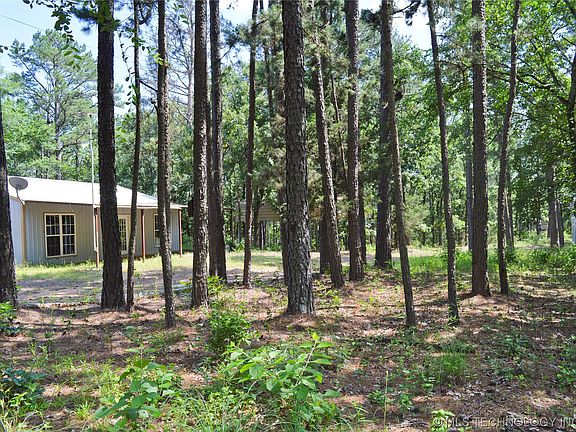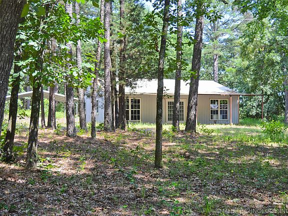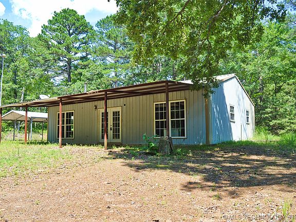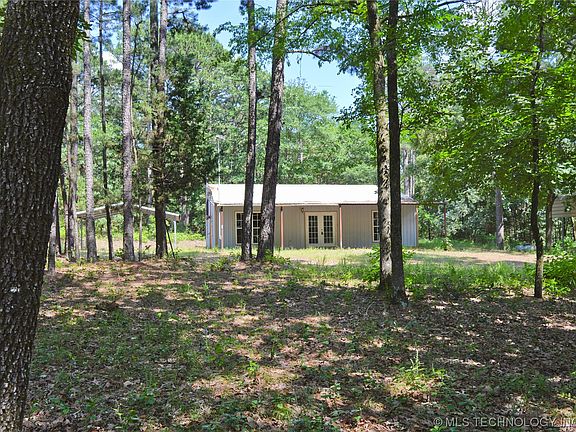This one-acre parcel of land lies within the beautiful Kiamichi Wilderness. Surrounded by pine and hardwood trees, the two-bedroom cabin is finished in rustic sheet metal and wood accents. Classy French style double doors grace the entry to give you a open feel. The great room is also spacious and roomy enough for multiple seating areas. Floors are a blank slate of exposed concrete throughout the home. Finish with your choices to make it reflect your personality. Check out the solid wood custom cabinets and island with bar stools. A combination utility/bath is built off the kitchen with a space saving design. Handmade wooden interior doors add a touch of charm. There is a stove pipe installed for those who enjoy a wood heater, as well as a propane hook up. An 18'x21' carport sits to the left of the home and a 31'x18' RV cover sits to the right! If that isn't enough, see inside the metal shop for extra storage! Electricity is onsite. Drill a well or set up a water collection system to provide water supply. This cabin is in a great location for solitude, peace, and quiet. Corners are clearly marked for boundary lines. Make this your escape today and relax on your own piece of wilderness.