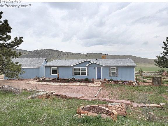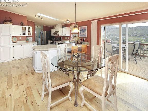 Ranch style home features open floor plan with 3 bedrooms with walk-in closets, 2 full bathrooms. Hickory plank floors throughout, stainless appliances, breakfast bar, tile counter tops,separate dining room and skylights. 2 car detached garage, deck with views in the fenced yard. Live the Colorado dream catching the glorious sunrise perched on the hillside south of Carter Lake.