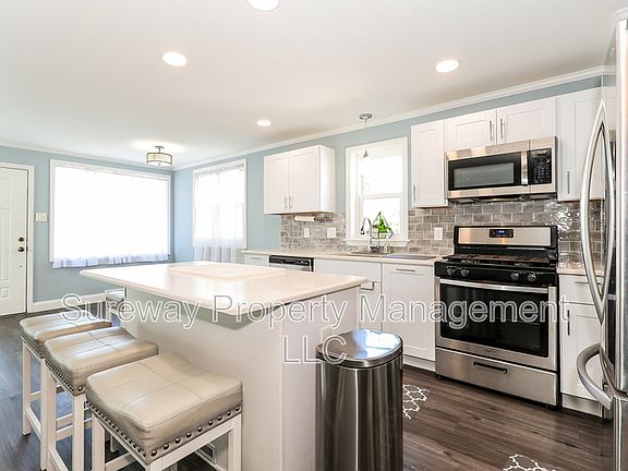 The bright and airy living room features large windows and hardwood floors, creating a warm and welcoming atmosphere. The updated kitchen offers plenty of cabinet space and modern appliances, making meal prep easy and enjoyable. Both full bathrooms are clean and well-appointed. Each of the four bedrooms is generously sized and includes ample closet space.