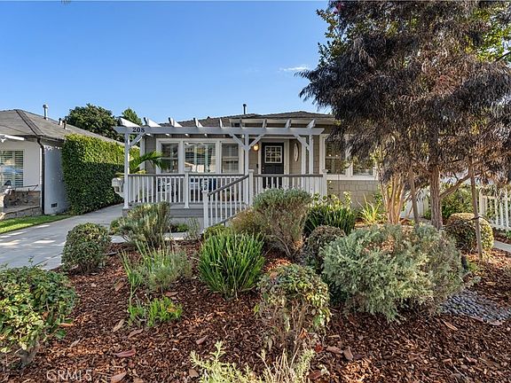 208 West Walnut Avenue in El Segundo welcomes you with its whimsical front yard landscaping, shingled grayish-green Cape Cod exterior, accented by crisp white windows and a classic white arbor. Stepping inside, you’re greeted by original hardwood floors in the living room, where an arched entryway flows seamlessly into the dining room. Both spaces are adorned with plantation shutters, creating a timeless and inviting atmosphere. The entire home has been freshly painted, including the kitchen cabinets, giving it a bright and polished look. In the kitchen, you’ll find an efficient layout with ample storage, a built-in Kitchen Aid refrigerator, and a cheerful window above the sink that fills the space with natural light. Three well-appointed bedrooms complement a bathroom that features a seamless barn-style shower door, built in bench, chrome fixtures and nostalgic penny tiles. The 1,080-square-foot main house is connected by a lush green space to the 780-square-foot “playroom,” permitted in 1957, complete with vaulted ceilings, a bar area, half bath, and sliding doors leading to a spacious private patio. A white picket gate encloses the driveway, while the two-car garage provides laundry hookups and abundant storage. Some noted features for the main house are central heating and cooling, two sets of dual-paned windows throughout, and a tankless water heater, offering modern comfort alongside timeless charm.