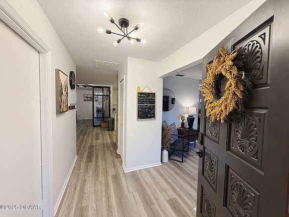 Welcome to your beautifully renovated dream home in sunny Daytona Beach! Located just minutes from Embry-Riddle, I-95, and only 10 minutes from the beach, this move-in-ready home can be purchased furnished as Seller is negotiable on furnishings. Enjoy fantastic curb appeal with new siding, soffit, fascia, gutters, stained driveway, and updated landscaping. Landscape lighting and a new irrigation pump add style and functionality. Inside, fresh paint, accent walls, and new light fixtures create a warm, modern vibe. The kitchen features a newer fridge and opens to spacious living areas—perfect for entertaining. The master suite includes a remodeled closet with custom shelving. A new divider wall adds privacy to the office, ideal for work or study. Additional upgrades include a tankless water heater for energy efficiency.