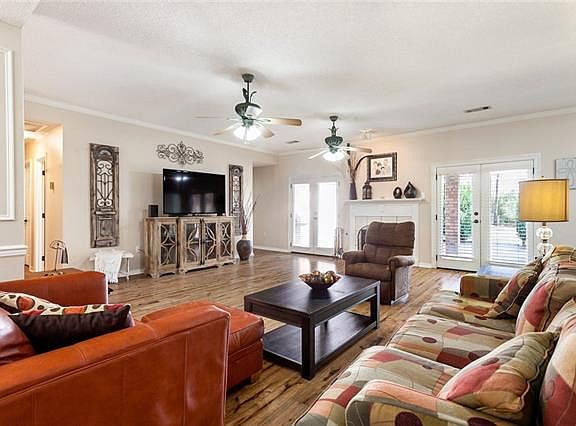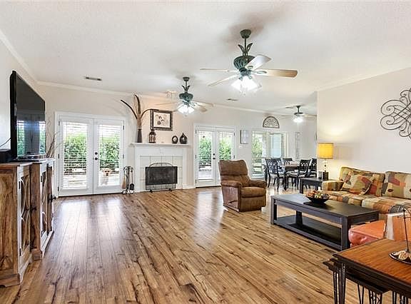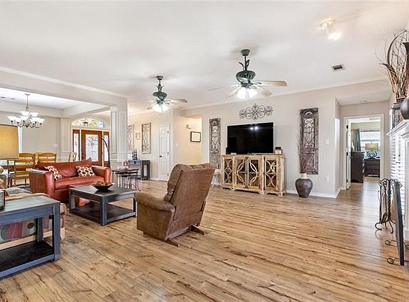 This four bedroom two bath home sits on a beautiful acre lot on a quiet street.Attractive foyer leads to dining rm framed by columns & large den.Den has fireplace,patio doors leading to covered patio,crown molding & wood floors.Kitchen features stainless appliances,granite counter,gas cooktop,pantry & breakfast bar.Spacious Master suite w/trey ceiling,masterbath w/dbl vanities,soaking tub and sep shower.Three additional large bedrooms.2nd bath with granite counter at vanity,no carpet,huge fenced rear yard.