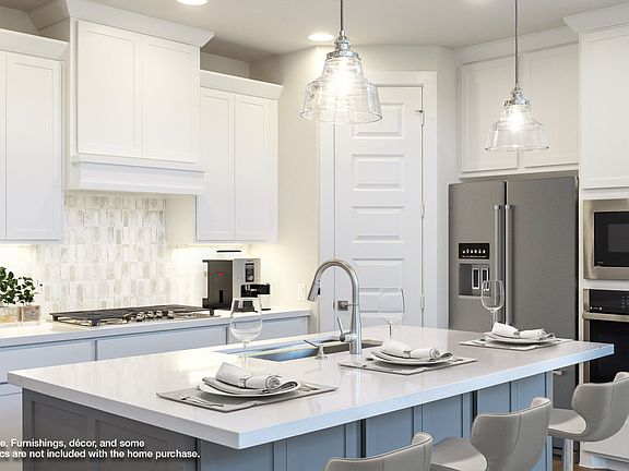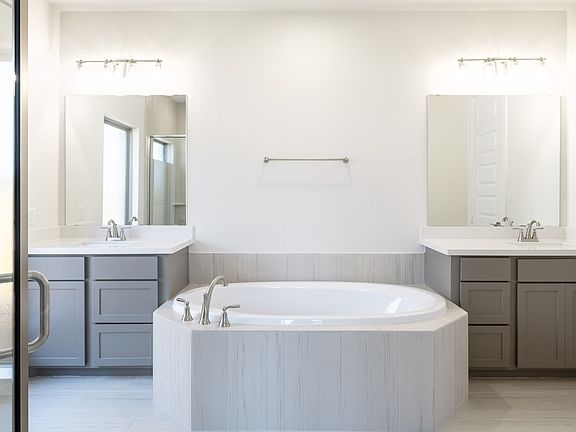 Home office with French doors and 11-foot ceiling set at two-story entry. Open kitchen features deep walk-in pantry, 5-burner gas cooktop and generous island with built-in seating space. Dining area opens to two-story family room with wall of windows. Primary suite includes bedroom with 10-foot tray ceiling. Double doors lead to primary bath with dual vanity, garden tub, separate glass-enclosed shower and large walk-in closet. An additional bedroom is downstairs. Secondary bedrooms and game room with 10-foot tray ceiling are upstairs. Covered backyard patio. Mud room off two-car garage. Representative Images. Features and specifications may vary by community.