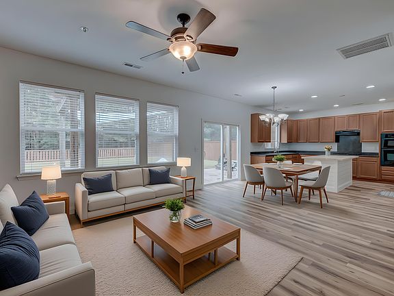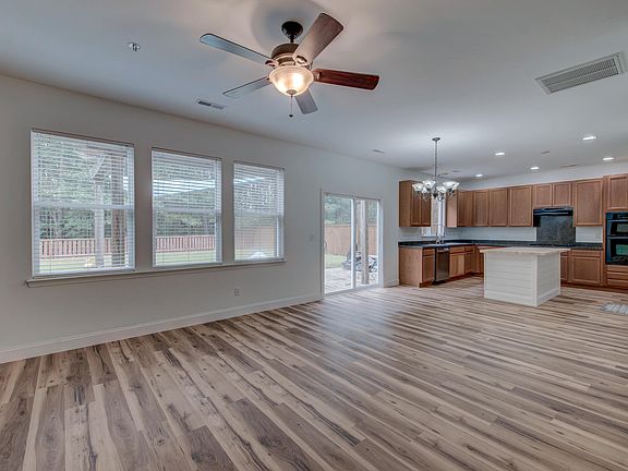 Inviting front porchLarge paver patioCenter islandSleek appliancesBeautiful flooringOpen floor planBuilt-in fire pit