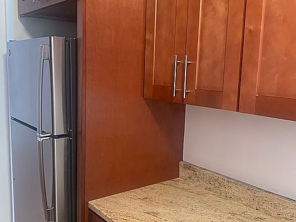 Renovated kitchen with 8 custom wooden cabinets built to the ceiling for extra storage. The stainless package includes all new appliances refrigerator, 4 burner gas store. and microwave. Granite counter tops and a large dining area The updated windowed bath.