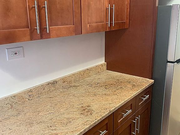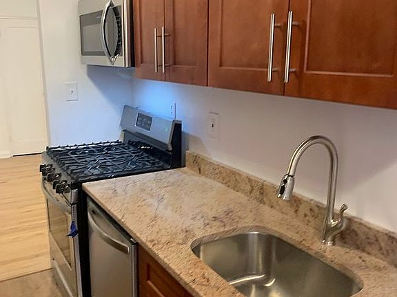 The well-sized kitchen is beautifully appointed with 9 custom wood cabinets soaring full height to the ceilings and trimmed with dental molding. Stainless steel appliance package includes 5 burner stove, dishwasher, microwave, refrigerator and sink. The charming bath has been updated and retains original tiling.