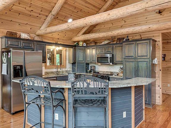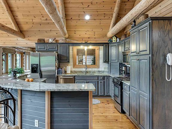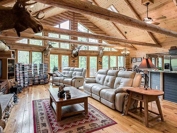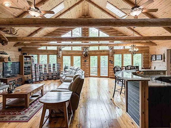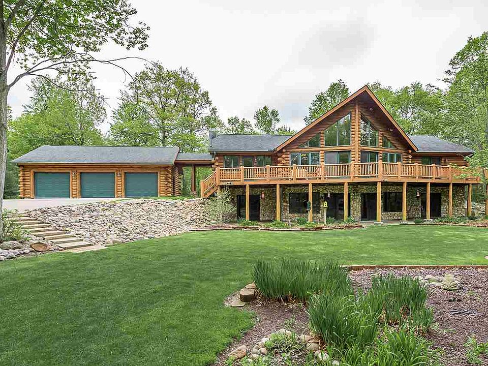 Beautiful split log home situated on 5 1/2 acres in Larkin Township. Get the feeling of being up north in this custom 2275 square foot home built in 2003. Cathedral ceilings in the living room with windows that go all the way to the peak give extraordinary views of the private pond and forest that surround this stunning home. The home is built on a full walk out basement with glass across the entire expanse that walks out to the pond. The elegant kitchen illustrates a work triangle at its best, where the sink is placed between the refrigerator and the range. The open design of the main floor features a field stone fireplace and stunning views. Situated next to the home is a 30 x 60 heated pole building with large overhead doors that allow easy storage of toys and outdoor equipment.