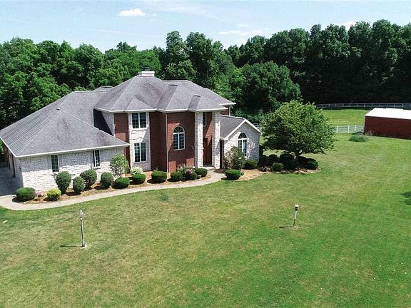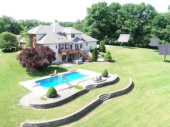 Stunning home w/ so much to offer from the grand 2 story entry to the beautiful floor to ceiling double sided fireplace. The chefs dream kitchen features corian countertops, gas range, double ovens, pantry & SS appliances. The master suite is on the main level w/ huge walk-in closet, soaker tub & separate shower. Relax in the sunroom by the fireplace or step out onto the upper level composite deck to take in the gorgeous views. The main level also has a lovely formal dining room w/trey ceiling, spacious laundry room & office. Upstairs features a 2nd master suite, 2 more BR w/ jack & jill BA. Anderson windows, solid panel doors, hardwoods & ceramic tile are throughout the home. The walkout basement has a guest BR, BA & tons of open space. Outside, you will find a luxurious in-ground pool, a 30x40 pole barn w/ electricity, water & oversized horse stalls, a fenced pasture, tillable & wooded acreage, solar panels & geothermal heat, resulting in remarkably low utility cost!