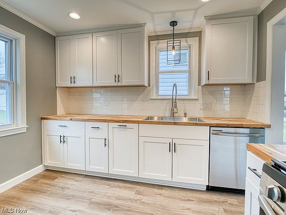 Welcome to one showstopper of a home! This beauty has been meticulously reimagined from top to bottom. Enter through the front door into the spacious living and dining area with all new vinyl plank flooring, modern paint and new lighting. The kitchen boasts gorgeous solid, wood cabinetry with soft close doors/drawers, butcher block countertops, subway tile backsplash and all new stainless appliances that remain. Head upstairs to find two generous bedrooms with new carpet and a fully updated three piece bath. The downstairs features a bonus room with vinyl flooring and an extra charming board and batten ceiling. An additional half bath is conveniently located in the basement. Make your way out back to a nicely sized yard and two car garage! There is truly nothing left to do but move right into this beauty. (New roof, windows, tankless hot water tank, furnace, A/C, shutters, paint, flooring, appliances, light fixtures, updated electric and plumbing)