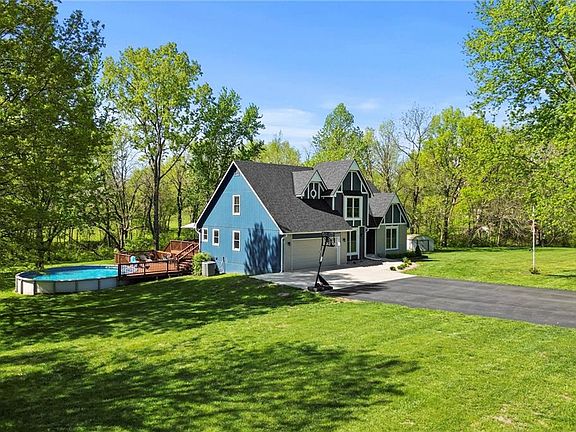 Amazing Acreage Property with main floor master suite in Kearney! Welcome to this beautiful 1.5 story home on 3 acres. The home has formal dining or office to your left as you enter. The Living room features vaulted ceilings and wood burning fireplace, and is open to the newly redone kitchen. Kitchen has painted cabinets, new granite tops, new backsplash and more. Covered Deck off the eating area in the kitchen. More uncovered deck for grilling and getting sun connects to above ground pool! Master Suite has a private bath and private balcony. 3 Bedrooms upstairs with a full bath. Finished walkout basement with another bedroom and bath, large living room, and additional room for office/exercise or storage. New interior paint, and light fixtures throughout. You'll love the serene setting of this one!