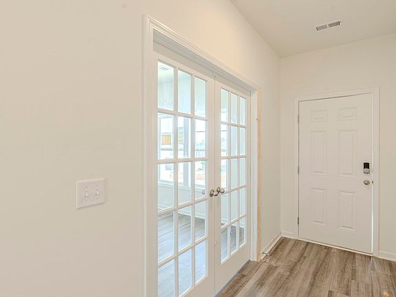 Situated on an oversized corner lot, you're greeted by a spacious foyer that leads into a dedicated home office, framed by elegant glass French doors—ideal for remote work or study and accompanied by a FULL bathroom. The heart of the home features a large kitchen equipped with a central island with granite countertops, an oversized pantry, stainless steel appliances, farmhouse sink, and an electric range/double oven combo.