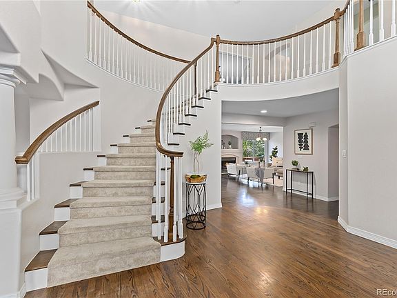 Exquisite Highlands Ranch home located on a prime lot a block from Spring Gulch Park. Pretty front yard landscaping provides great curb appeal and a warm welcome to a grand entry inside with soaring 2-story ceilings. Both formal and informal living spaces found in this gem with newer carpeting, hardwood floors, and fresh interior paint. High-end workmanship with a beautiful spiral staircase and arched entryways with columns are just the beginning. The sliding door off the family room opens to the beautiful private backyard with extensive patio ready for summertime entertaining. Many mature trees and full fencing offer ample privacy. Incredible upstairs primary retreat complete with a dreamy walk-in closet, spacious 5-piece en-suite, and a door to a private balcony offering peek-a-boo mountain views – a perfect haven for relaxing after a long day. Five additional generous-sized upstairs bedrooms, all with baths. More living space in the fully finished basement with 3 versatile flex rooms that are ideal for entertaining family and friends. Perfect for the outdoor enthusiast, you’ll absolutely love the nearby hiking and biking trails, and four amazing Highlands Ranch recreation centers with their weight rooms, tennis courts, pools, pickleball courts, and water slides. This gem is a must-see and ready for you to call it home!