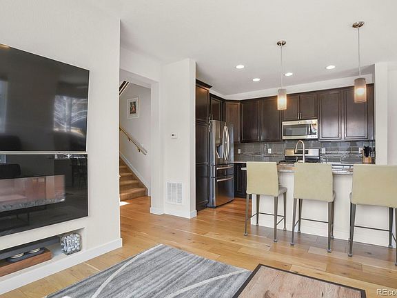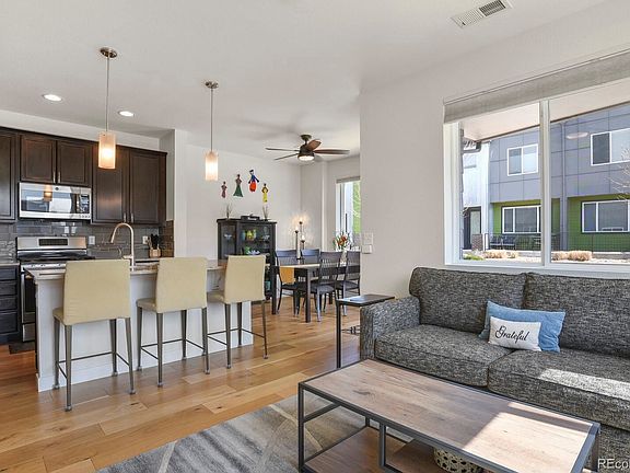 Majestic Mountain and Downtown Views with this end-unit immaculately maintained 3 bed/3 bath home located in the highly sought after Midtown neighborhood! Ample natural light throughout in this spacious open concept layout home. It features 9 foot ceilings, New Sherwin Williams Emerald premium throughout, $1,200 dollar upgraded security front screen door, European heavy duty shower door, new roof in 2020 with hail resistant class 5 shingles, upgraded garage doors in 2020 and a full Frontpoint security system that is transferable to the new owner. The main floor has a sunny living area with a large kitchen and dining area with access to patio and mountain views, powder bath and laundry room. Kitchen has a generous island for entertaining, quartz countertops, 42" cabinets and stainless steel appliances. Upstairs you will find the owner's suite featuring a 5-piece master bath with dual vanity, soaking tub, frameless Euro shower, and large walk-in closet. The master suite opens to another balcony with mountain views. There are two additional bedrooms on the upper level with a full bath and loft/study. The renovations and upgrades amount to well over $25,000. Home includes central air and a 2 car garage with ceiling installed racks. Take full advantage of how close you would be to the award winning brewery, food truck rotation, events, restaurants, dog parks, multiple parks, walking and biking trails, two light rail stations, schools, and easy highway access to other highly desirable neighborhoods like Tennyson, Downtown Denver, the Highlands, Olde Town Arvada, and Boulder! No post occupancy needed.