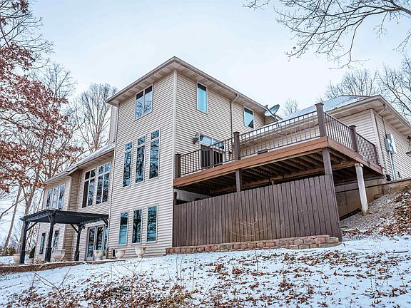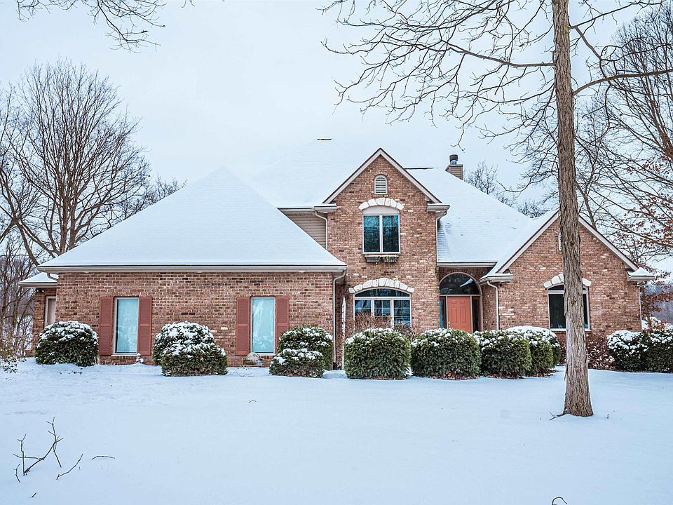 This custom brick home demonstrates luxury from the moment you pull in the drive! This wooded Waterfront property is sure to impress! Exterior quoin corner facade with stone accents and a side-loading garage for added curb appeal! Spacious two-story foyer leads to the gracious living room with gas fireplace and decorative columns. Floor-to-ceiling windows ensure the view can be enjoyed from every angle. Den is just off the entry. Gorgeous Brazilian cherry floors flow throughout the main level. Premium trim and crown molding, everything here is top-notch! Brand NEW Kitchen with granite counters to enjoy cooking meals in. Main level master suite incorporates a large wardrobe with spa tub and tiled shower. Upstairs there are three generous bedrooms and an additional full bath with tiled surround. Closet space has been maximized thanks to Closet Tamers! The full walk-out basement is designed to suit all occasions from entertaining guests to relaxing after a day at work. Wet bar, wood burning fireplace, 5th bedroom, full bath with tile shower, and rec room are just a few of the many features offered in the space. The home's exterior showcase is the 9 acres stocked lake that offers a one-of-a-kind wooded setting. You could live off the land with this property.