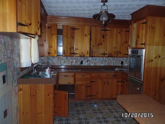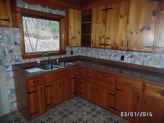 Just charming describes this two bedroom ranch. Possible 3rd bedroom use however has no closet. Home features log interior features, pegged flooring, large stone fireplace and beamed ceiling in living room. Situated on wooded lot with two car detached garage- needs work. Bank of America, N.A. employees and employees' household members and HTS business partners of the Bank, are prohibited from purchasing this property, whether directly or indirectly.