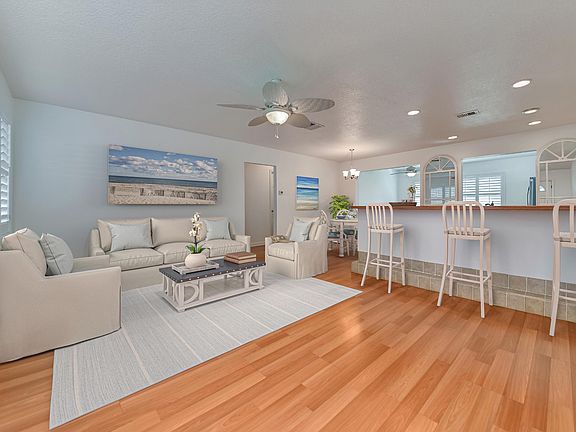 Beautiful Fairmont 2Br/1Ba home with thousands in upgrades. Close to R3 Clubhouse and Pool. Open living area with lots of extra cabinetry and counter space. Great for entertaining. Hurricane Impact windows and garage door. Roof replaced 2010. A/C replaced 2020... Electrical panel 2016. Recessed lighting. Washer/Dryer 2019. R19 Insulation in attic. Remote fans with lights in both bedrooms. Plantation Shutters. Some windows have accordion shutters for double protection with Hurricane windows. Front porch has insulated roof. Paid up recreation lease in full. FREE 18 Hole Par 3 Golf course, 3 Heated Pools, 3 Clubhouses, fitness center... Minutes to Ocean Beaches, shopping and restaurants... Vacant for quick close... A MUST SEE......Rooms are virtually staged in photos