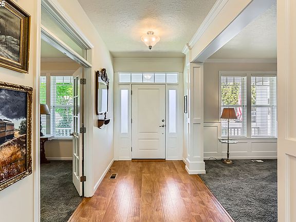 Discover this beautifully maintained home offering 3 spacious bedrooms, a den, and a large bonus room - providing all the space you need for work, play, or relaxing. The open floor plan connects the great room to the kitchen, breakfast bar, and cozy eating nook, creating a natural space for gathering and entertaining. Vaulted ceilings and large windows fill the home with natural light and offer a view of Mt. Hood. The primary bedroom is conveniently located on the main floor for easy, everyday living, while the upstairs bonus room is a versatile space—ideal for a home gym, game room, theater, or whatever fits your lifestyle. Recent updates include a new roof (2021), fresh exterior paint (2021), and a new gas furnace (2024), giving you peace of mind and move-in-ready comfort. Step outside to enjoy the privacy of a fully landscaped backyard that backs up to open farmland. Meandering garden paths, a peaceful water feature, and a patio with a retractable awning create the perfect setting for outdoor living. Located in the picturesque and historical town of Aurora, this home offers a rare combination of small-town charm, modern comfort, and easy access to Interstate-5 for convenient commute or travel. The Aurora City Park that features tennis courts, baseball field, picnic shelters and more, is just minutes away. Don't miss the opportunity to live in a town rich in history, where charming specialty shops, antique stores, wineries, and more, are just around the corner.