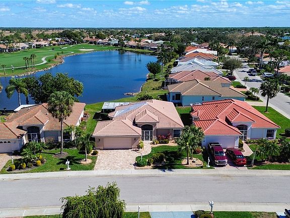 Amazing LAKEFRONT Villareal home in HERONS GLEN COUNTRY CLUB has an updated, laid back feeling, and the most SUBLIME VIEWS through the sliding doors and from the spacious expanded lanai. The living area is bathed in natural light from a skylight, and the 18-in tiles accentuate the spaciousness of the great room. Crown molding, a custom room divider and versatile lighting make it a modern and elegant space. There is a large kitchen with eat-in area, and TWO MASTER SUITES, each with a WALK-IN CLOSET. The bathrooms have both been TOTALLY RENOVATED with custom vanities and linen closets and there is a sunny, spa-like shower in the primary master en-suite, offering the perfect retreat after a long day of enjoying the community’s many amenities. A DEN with double doors makes an ideal office or craft room. Your favorite space however, is going to be the oversized COVERED LANAI with PICTURE WINDOW SCREENS to maximize the AMAZING VIEW of the large lake and golf course. The home exudes curb appeal with a paver driveway, stone mulch, 2021 EXTERIOR PAINT, and an EXTRA-WIDE GARAGE. There is a 2022 new A/C, hurricane shutters throughout and a NEW ROOF was installed just weeks ago!