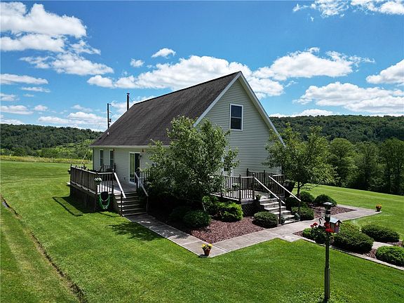 Come experience rural living and great views at their finest! Nestled in the hills of Troupsburg, this fantastic 2-bed, 2-bath home will allow you to come in and put your personal touches on it. The main level find an open concept kitchen-dining combo. From there a spacious living room leads to the primary bedroom with en suite, another large bedroom and a full bathroom with laundry hook-ups. Upstairs is a blank slate for you to come in and make it your own. The full basement offers plenty of additional storage space and can also offer the possibility of finishing it into living space giving you endless potential. Head outside to soak up the great views that this property offers! Multiple porches offer great space for entertaining or for watching the wildlife pass through. A single bay garage can double as a workshop, or storage for cars/ATV's/UTV's and lawn equipment. The 17.47+- acres can host a variety of large and small game, ranging from Bear, Whitetail, Turkey. Relax by the small pond and enjoy nature, or cast see what bites. Come enjoy everything that the Southern Tier has to offer! Don't miss your opportunity to own this fantastic property!