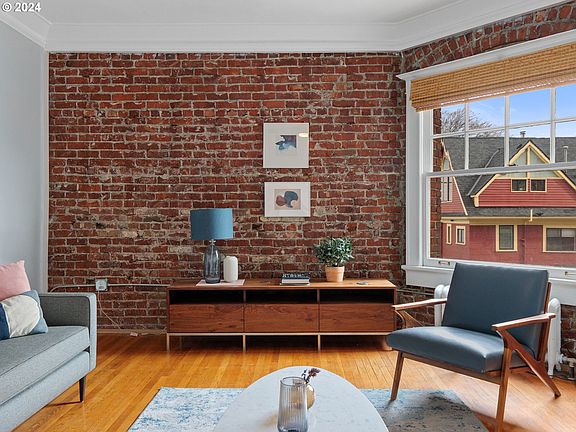 Upon first glance at the Ball Parc American building, you'll feel transported back to Portland's Alphabet District in the 1910s. Walking through the deep courtyard to the grand staircase entrance, marvel at the original lobby details, including its fir trim-cased columns and beams, wainscot, and paneling. While the condo exudes vintage charm, it also has the ideal floor plan for today's living, with a dining and living great room that connects to the updated kitchen through a pass-through window. Period features, like the built-in dining/bar cabinet with leaded glass doors, hardwood floors, exposed brick, bay windows, cased openings, and vintage telephone, provide historic charm. The 1,102 square-foot floor plan includes two bedrooms (including one with a covered balcony), one bathroom, and numerous in-unit storage spots. Immediately out of the front door is a private storage closet with a washer, dryer, and additional space for belongings. While you'll get the city's best shopping, restaurants, and entertainment out your front door, the unit has a parking space in the adjacent outdoor lot if you must travel. The block of NW 21st and Johnson is the best of both worlds, with Johnson having a residential and neighborhood feel, while NW 21st Ave is one of Portland's most vibrant and trendy streets. Don't miss your chance to own in one of the Alphabet District's best condos and a building that's listed on the National Register of Historic Places!