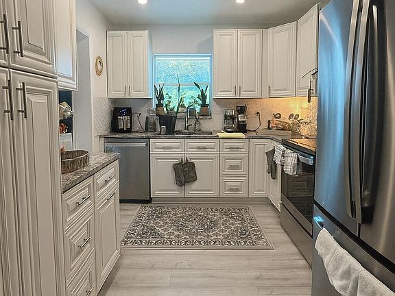This spacious single-family home offers nearly 2,400 sq ft of living space with a perfect blend of comfort and functionality. Originally a duplex, it has been beautifully converted into one cohesive home featuring two kitchens--one newly remodeled in 2022 with modern finishes and another offering added convenience for large families or guests. Two central A/C units (5-ton and 4-ton) installed in 2017 ensure year-round comfort, while impact windows provide safety and efficiency. The exterior boasts durable aluminum siding completed in 2018 and a wide driveway fitting up to 18 cars. In the back, you'll find a garage space and a shed for extra storage.