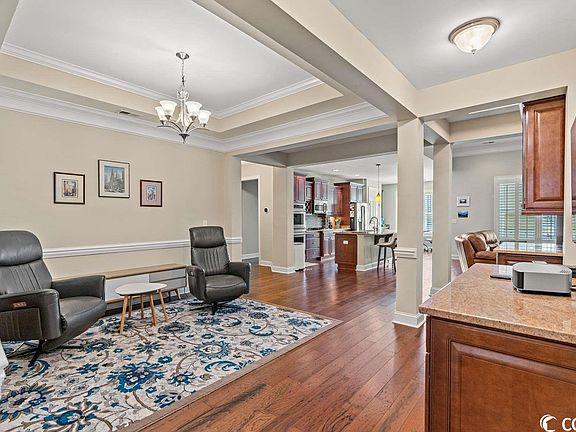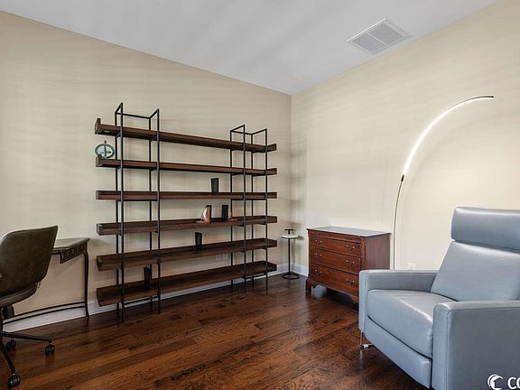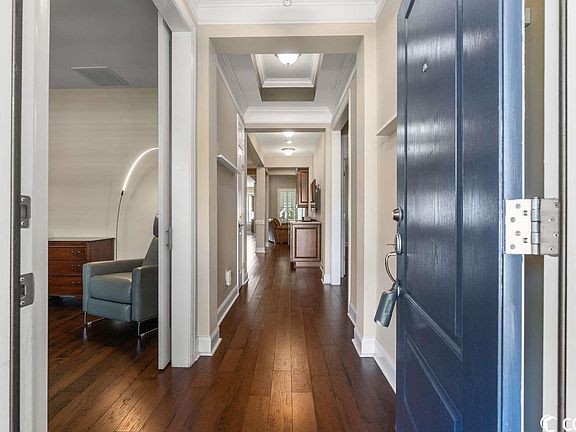 Welcome home to this 4 bedroom, 3.5 bathroom home on a rare, premier lake-front lot in the highly sought after community, Cresswind in Market Common. This home is the largest floor plan in the community, and features luxurious wood flooring throughout the main level, with plantation shutters, crown and decorative molding, a water filtration system, a generator, hurricane shutters, and so much more! The kitchen is equipped with all stainless steel appliances including a gas range, double ovens, a large pantry, upgraded countertops with a work island and a breakfast bar, and a breakfast nook- separate from the more formal dining room. The living room features a fireplace as a main focal point, with built ins on either side, while the formal dining room includes a built in china cabinet and a wet bar with a wine fridge. Each bedroom includes plenty of closet space, and easy access to a bathroom, while the master also includes a huge walk in closet, double sink vanities, and room for a seating area to relax! An office as you enter the foyer is the perfect space to work from home, or could be used as a playroom, rec room, you name it! The bonus room upstairs would make the perfect guest suite, as it features its own bathroom, AC unit, and closet! Enjoy afternoons in your Carolina room, or relaxing in your backyard oasis with a view of the lake with a fountain. Perfectly situated within walking distance to the community clubhouse offering a 15,000 sq ft amenities center, fitness room, resort style pool, walking trails, picklebal, tennis, bocce ball, and more! Close to the famous shops and dining of the Market Common, and just a short drive to all of the Grand Strand's finest dining, shopping, golf, and entertainment attractions. You won't want to miss this! Schedule your showing today!