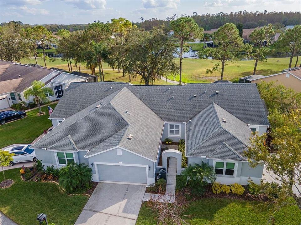 Discover your retirement paradise in this stunning 2-bedroom, 2-bathroom golf-course view villa with a den and 2-car garage, nestled in the prestigious 55+ gated community of The Groves Golf & Country Club in Land O’ Lakes, FL. This home offers gorgeous golf course views, elegant crown molding, and 5-inch baseboards throughout. Step through the private courtyard entrance and be welcomed by a charming front porch, setting the tone for the elegance within. Upon entry, you’ll be captivated by tasteful updates and a spacious dining and living area that seamlessly flows to a private, screened lanai overlooking the 14th hole. The expansive kitchen boasts a breakfast nook and large peninsula, perfect for casual dining or entertaining. The split floor plan ensures privacy, with the primary bedroom offering beautiful golf course views an en-suite bath with dual vanity, walk-in closet, and a renovated stand-up shower. The second bedroom, situated on the opposite side, is adjacent to a full bath with a bathtub. Additionally, a versatile den awaits, ideal for use as an office, craft room, gym, or reading area. Additional features include new tile flooring throughout, fresh interior paint, plantation shutters, a new A/C (2024), hurricane shutters, and a roof installed in 2019 with exterior paint refreshed in 2022. The Groves offers a vibrant, active lifestyle** with amenities like golf, tennis, pickleball, bocce, shuffleboard, yoga, aerobics, a community pool, and more. Residents can enjoy social events like karaoke, bingo, and cards, or explore the dog parks, butterfly garden, and vegetable garden. The clubhouse features a full-service restaurant open seven days a week. Your HOA fee covers Spectrum Internet & TV, lawn maintenance, and all community amenities, including a new roof every 17-20 years and exterior paint every 7-10 years. The Groves is pet and golf cart friendly and conveniently located near banks, hospitals, supermarkets, and restaurants, with Tampa International Airport just 30 minutes away and beaches 40 minutes away. Don’t miss your chance to secure this beautiful, move-in ready home! Call today to schedule your viewing!