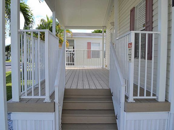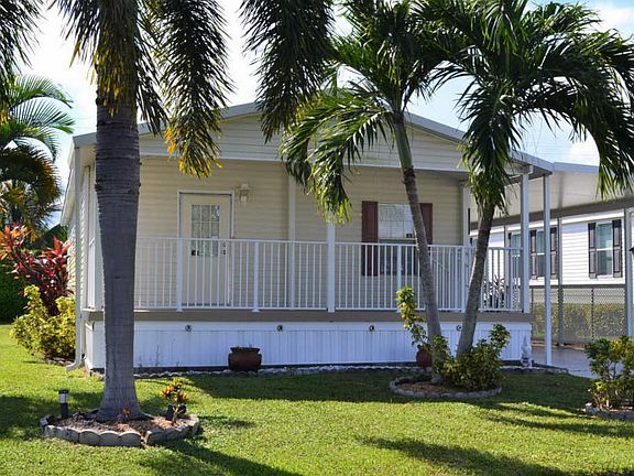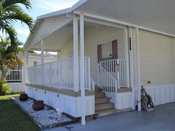Beautifully updated 2006 double wide mobile home in popular 55+ West Lakes of Boca Raton. The beautiful covered front porch and the steps to the main entrance have maintenance free wood composite flooring. The remodeled kitchen has white panel cabinets and newer appliances. Beautiful tile flooring graces bedrooms, vinyl flooring in kitchen and bathrooms, with wood flooring in the living room. The floor plan features an open kitchen and living room with vaulted ceilings. This home has a split bedroom layout. The third bedroom opens to the front porch and can be easily used as a den or home office. A full size washer and dryer are in a separate laundry room off the kitchen. The master suite features a walk-in closet and a beautiful, spacious master bathroom.