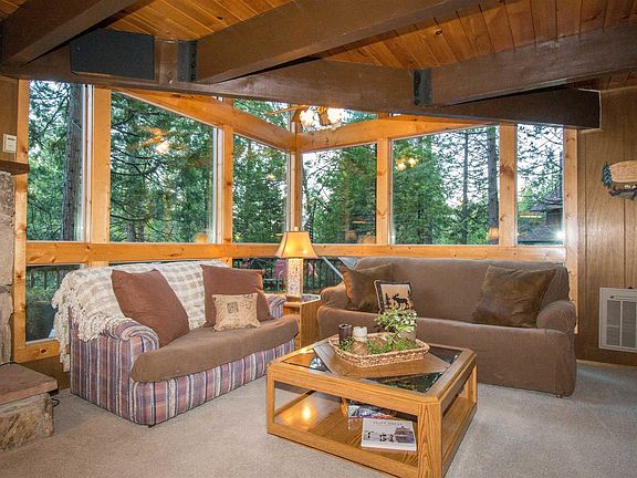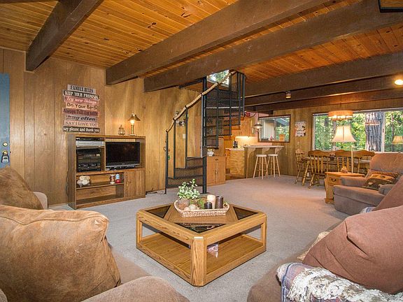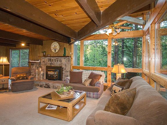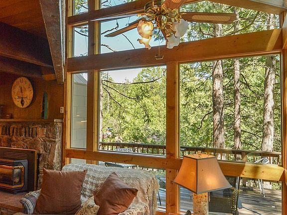 BRAND NEW TO MARKET! Unique opportunity here with such a lovely, eclectic cabin nestled in the woods at the end of a court with floor to ceiling, custom wood framed windows... inviting the outdoors inside from every room. Soaring open beam ceilings offering cabin tradition with warm knotty pine accents and cozy stone fireplace. Full bedroom & bath on main entry with laundry room and kitchen with breakfast bar. Charming circular staircase with loft style bedrooms upstairs sleeping plenty of kiddos and guests boasting natural sunlight and views of sierra mountain foliage with full bath and upper family room. Plenty of space to spread out and entertain on the back deck overlooking impressive rock formations.