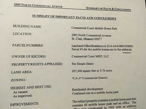 Great Investment $16,000 MONTH RENTAL ROLL, 40 unit park, 2 storage buildings, 1 House, laundromat (laundromat currently closed) . HAS approx 860 ft of I44 FRONTAGE...Currently house is being used as office but could be more rental income, plumbing needs hooked up to main line. There are 2 lots that are pad rent only, 38 homes are owned and go with park. Rent Roll is $16,000 plus a month. Owner pays for water , trash, and sewer. Lagoon permit is good until 2020, but some new DNR is asking for the Solids and Ammonia limits to go down. Worst Case a new treatment facility $125,000 quoted verbally to me 4 years ago but we have no definite from DNR. Park is completely occupied, and has a waiting list for renters needing low income housing. Manager works for $200 month, and Maintenance Man works for free rent . Rent could be increased and tenants could start paying own trash bill and house could be rented, and laundromat could re-open for more income.
