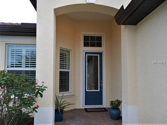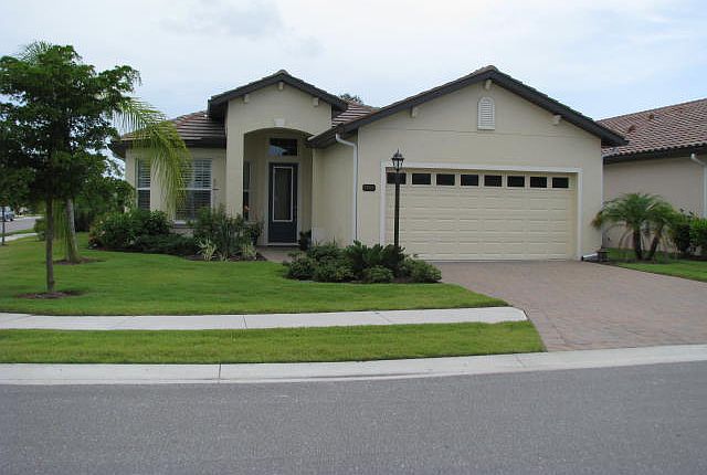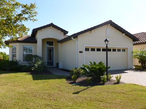 Welcome to Grand Oaks, a charming gated enclave of 55 homes located in Venice, FL. This beautiful 3 bedroom, 2 bath home is situated on a premium waterfront corner lot. Upon entering, you'll be impressed by the volume tray ceilings & crown moldings in the foyer, dining room, kitchen, Great Room and master bedroom. Porcelain tile and laminate floors throughout! The kitchen has custom crafted cabinets, built in pantry, granite counter tops, under cabinet lighting and upgraded GE Slate finger print resistant appliances. The 12' pocket sliding door leads to the lanai with a spectacular view of the lake. The Owners Suite offers two walk in closets, separate shower, soaking tub, granite counter top with dual sinks. Open floorplan with upgrades including designer light fixtures, ceiling fans, plantation shutters, blinds, laminate flooring in all bedrooms, retractable front screen door and pull-down attic stairs. Freshly painted interior and move-in ready! You'll enjoy peace of mind with impact windows on the front of the home, impact resistant raised panel garage door and hurricane impact panels for the remainder of the house. Just 3.5 miles to the historic Main Street of Venice and the Gulf beaches. A low maintenance community with landscaping & lawn care included for a low monthly fee and no CDD!
