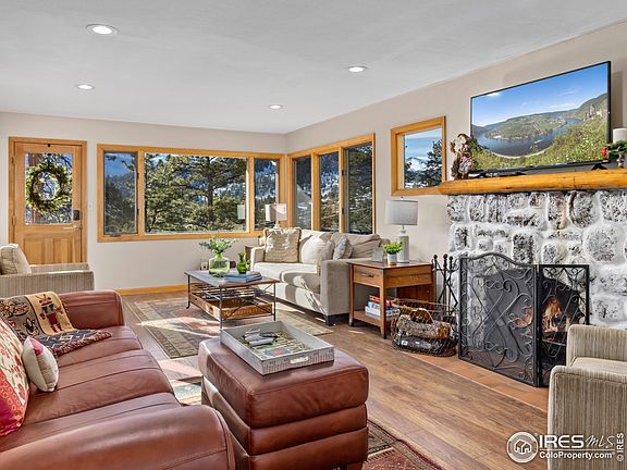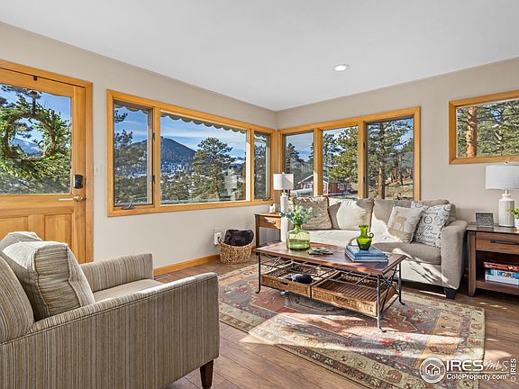 Adorable cottage at the entrance to Rocky Mountain National Park with stunning mountain views. Beautifully updated with 3 bedrooms / 2 full bathrooms. Main level living includes living room with wood burning, river rock fireplace & lots of windows framing Estes Park's only fourteener, Longs Peak. All new kitchen & new luxury vinyl flooring throughout the house. Spacious dining room with walls of windows to enjoy the view in all directions & french doors that open to the deck plus twin size dormer nook tucked away under the stairs. 2 bedrooms on the main level and 1 updated full bath. Bedroom 2 has new french doors that open to the deck & focuses on the mountain views plus a laundry closet. Upper level is the primary suite with vaulted ceilings, an updated full bathroom that includes a large soaking tub plus opens to a private balcony with a commanding view of Longs Peak. So much outdoor space to enjoy the 1.11 acres. Newly expanded deck runs the full length of the house and is supported for a hot tub plus has a new retractable awning. Two flagstone patios out back plus a 21x11 shed offers so much potential for storage, workshop, art studio. Not only is this property full of charm there are so many more updates! New well, recently connected to sewer, all new windows, new roof, all new kitchen, 2 new flagstone patios, concrete driveway, added a washer/dryer & freshly painted inside and outside. Ideal for year round living or your mountain getaway, this property is a must see!