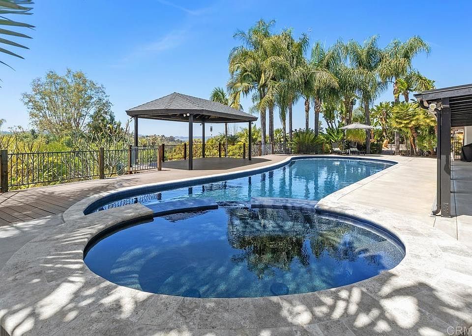 Exquisite single level home with a detached gym and energy saving solar panels in the heart of Granite Hills. This property offers the perfect combination of style, comfort and practicality. The appealing floor plan with large rooms, acacia wood floors and natural light creates a warm and relaxing tone throughout. The yard is reminiscent of a tropical resort, with a large solar heated pool, jacuzzi, cabana, deck, expansive covered patio, landscaping that includes mature fruit trees, exotic cycads and multiple varieties of plumeria trees overlooking an incredible view of the city. Perched on large lot in a quiet neighborhood, with plenty of room for an ADU, this home is perfect for entertaining guests or spending quality time with your family. Come and experience the splendor of this amazing property.