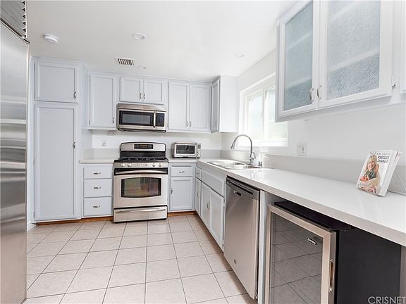 This spacious move in ready home has been freshly painted throughout, and has new quartz countertops in the kitchen and downstairs bathroom, smooth ceilings, recessed lighting, beautifully updated fireplace to relax by with a glass of wine, double pane window throughout that open from the top and bottom, new HVAC with humidifier. Upstairs, enjoy a large master bedroom and en-suite. The master bedroom has two very large closets and a separate area that can be used as a den, office, nursery or gym. The master bathroom has dual sinks and make-up vanity. There are also two more good sized bedrooms and another bathroom. You'll love the safety and convenience of the attached 2 car garage with direct access to the home and washer/dryer hook ups. There's a large patio to entertain or enjoy your morning coffee. and a little garden. There's plenty of storage and an attic. This home is situated in a gated community of just 11 homes. Each home is only attached to one other home, making it feel like a single family home. Ideally located just minutes away from the 118 and 101, the new exciting Topanga Village, Fashion Center, Costco, Cal State Northridge. Walking distance to many amenities such as restaurants, gyms, Starbucks... HOA covers water, trash, and outside of unit just like a condo.